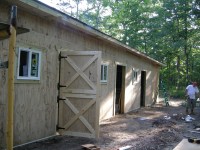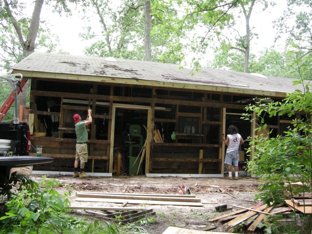 After clearing away a few year’s worth of leaves, brush and the “dumped debris” beneath, the foundation was shored up and the hopelessly rotted facade removed. We rented one of those huge demolition dumpsters as there was also tons of trash and scrap left behind and/or dumped both inside and outside the barn by a prior owner who was in the roofing and siding business. The west side of the barn (as seen in the first photo above) was in the poorest condition, so that was tackled first.