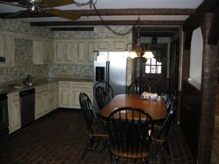 The wallpaper was kind of cute, a vining ivy pattern, the cabinets were old, filthy, piss-poorly faux “antiqued,” and lacking any contrast whatsoever against the light-colored walls. Posts and beams may appear rustic and charming at first glance, but these too are “faux” and not even realistically hewn; more like “Bam-Bam was here.”